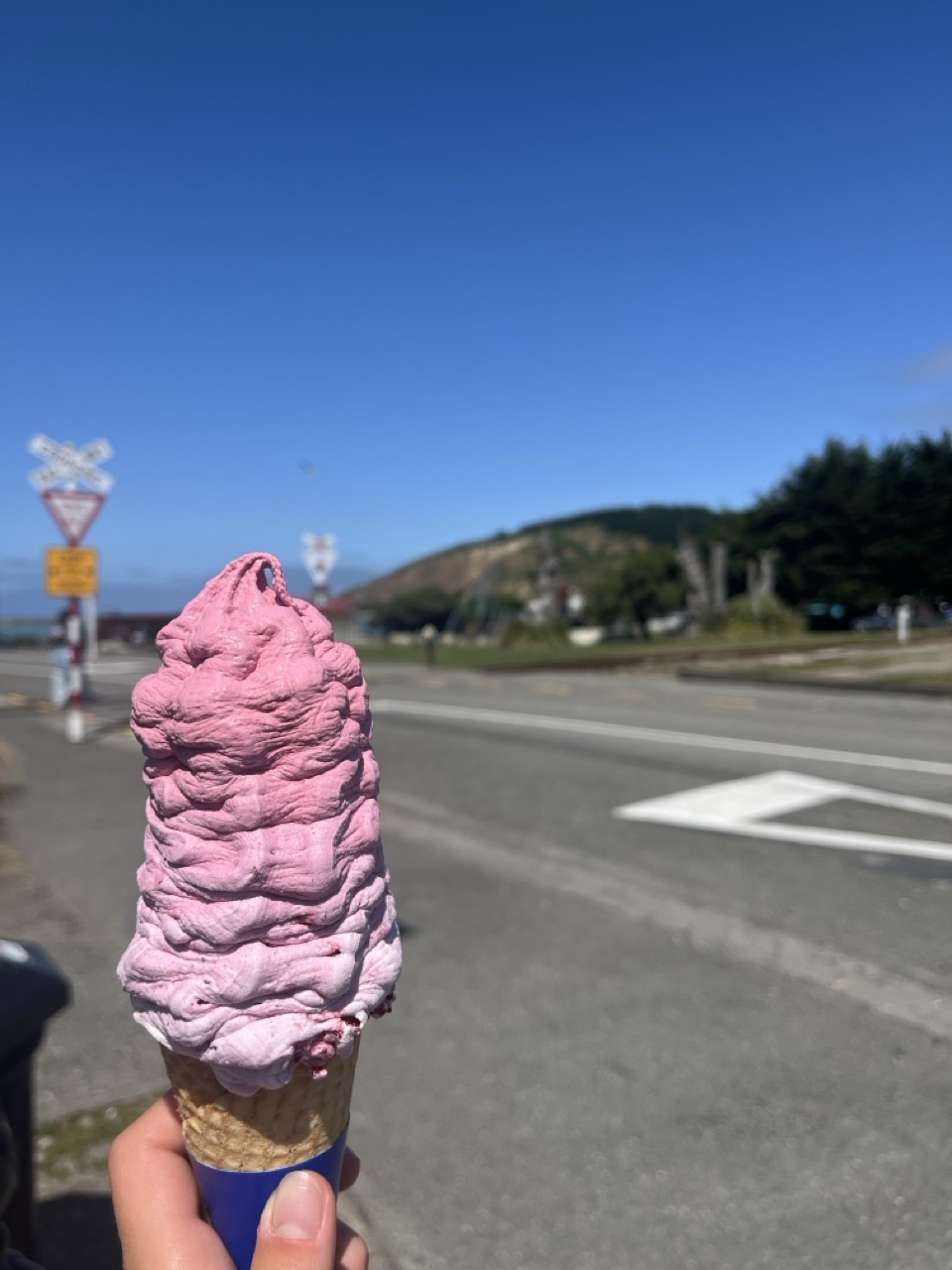 In Queenstown wanderte ich hinauf zur Gondel Station – man muss ja Geld sparen und Bewegung machen – und dann noch ein bisschen Weiter und schaute mir die Stadt von oben an. Am Weg hinunter gab es Real Fruit Icecream – man muss ja nicht an allen Enden sparen – und am Abend durfte ich wieder einmal einen sehr atmosphärischen Sonnenuntergang mit Pianomusik am Strand miterleben.