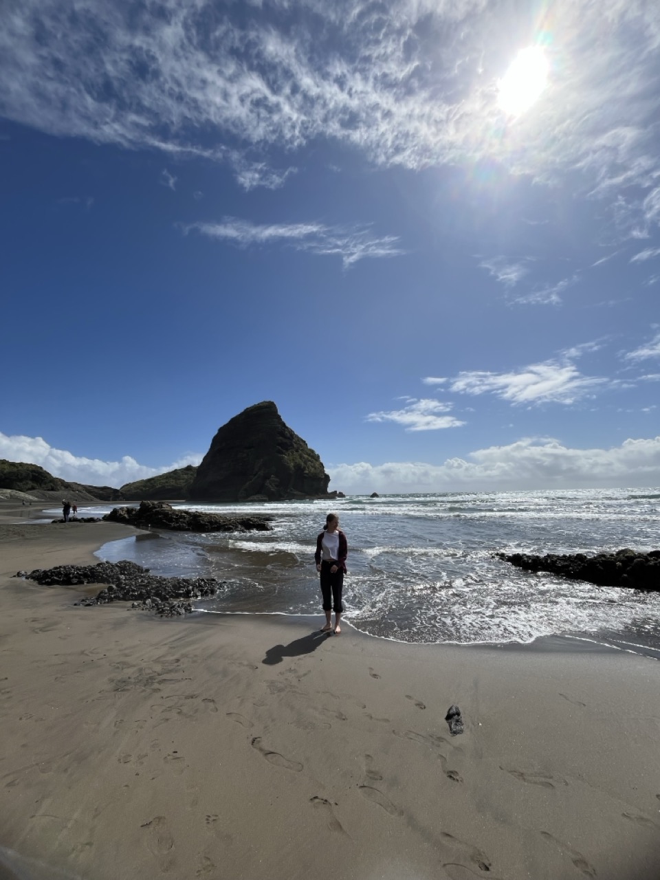 Am Sonntag haben wir dann zu viert ein kleines Abenteuer erlebt, das man wohl in die Kategorie “Selber schuld kein Mitleid” stecken könnte. Wir sind mit dem Uber nach Piha Beach gefahren. Soweit so gut. Nur liegt Piha etwa 40 min westlich von Auckland und ist normalerweise nur mit dem eigenen Auto erreichbar. Oder eben mit dem Uber. Der Tag war schön, das war das erste mal Neuseeland-Natur für mich, da ich ja davor nur in der Stadt war. Wir haben einen wunderschönen Sonnenuntergang gesehen und wollten dann wieder nach Hause fahren. Da begann das Dilemma, denn um 20:00, an einem Sonntagabend, an dem der Montag danach ein staatlicher Feiertag ist, möchte sich kein Uber 40 min aus der Stadt hinaus bewegen um vier junge Touristen vom Strand abzuholen. Also versuchten wir unser Glück mit dem Anhalten von Autos um zu erfahren, das heute wohl niemand mehr in die Stadt fahren würde, doch wir einmal zum Campingplatz gehen sollten, da würde man uns noch am ehesten helfen können. So wirklich verwundert über unsere Situation war jedoch niemand, anscheinend waren wir nicht die ersten, die von einem Uber-Fahrer ausgesetzt wurden. Am Campingplatz wurde uns dann tatsächlich geholfen und ein Taxi gerufen. Schlussendlich haben wir es, deutlich später als geplant, doch noch zurück ins Hostel geschafft.
