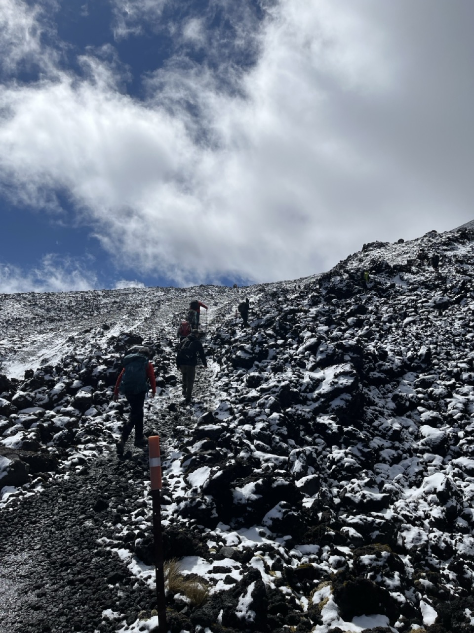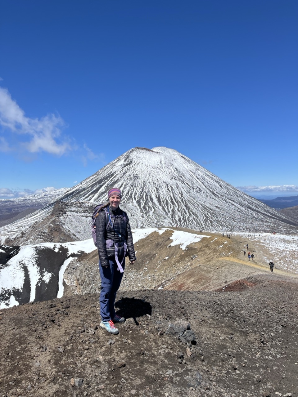 Den nächsten Tag verbrachte ich damit Taupo zu erkunden und mich seelisch auf einen frühen Start am nächsten Morgen einzustellen. Die Stadt selbst ist nicht sonderlich groß, so ist man mit Sightseeing relativ schnell durch. Eine der größten Attraktionen ist eine McDonalds Filiale mit einem alten Flugzeug, in dem man nun seinen Burger essen kann (ich denke das sagt genug darüber, wie spektakulär die Stadt ist). Am nächsten Tag ging es für uns (ich hatte zum Glück wieder eine Mitfahrgelegenheit) um 5:30 los um das Tongariro crossing zu bewältigen. So wie ganz, ganz viele andere Leute auch. Man würde denken, dass die Idee einer 6-8h langen Wanderung viele Leute abschrecken würde, aber anscheinend blieben dennoch genug unerschrockene Touristen über, so dass der Wanderweg aus der Luft wohl einer Ameisenstraße ähnelte. Vorbei an Vulkanen und einem Kratersee ging es 21km und 740hm durch eine Landschaft, die so karg war, dass sie als Drehort für Mordor herhalten musste – wohl auch ein Grund dafür, dass wir nicht gerade alleine waren auf dieser Wanderung. Am Weg nach oben mussten wir auch das ein oder andere Schneefleckchen durchqueren, das hat mich sehr gefreut, immerhin hatte ich nicht gedacht, vor Ende 2025 noch einmal Schnee zu Gesicht zu bekommen. Hin und wieder hörte man auch ein tiefes Grollen, was für uns die Fragen aufwarf, wer wohl als erstes mitbekommen würde, wenn wir durch einen Vulkanausbruch enden würden. Zum Glück mussten wir unsere Theorien nicht testen. An sich war es eine wunderschöne Wanderung. Zwar lang, aber nicht super schwierig und leider sehr überlaufen.