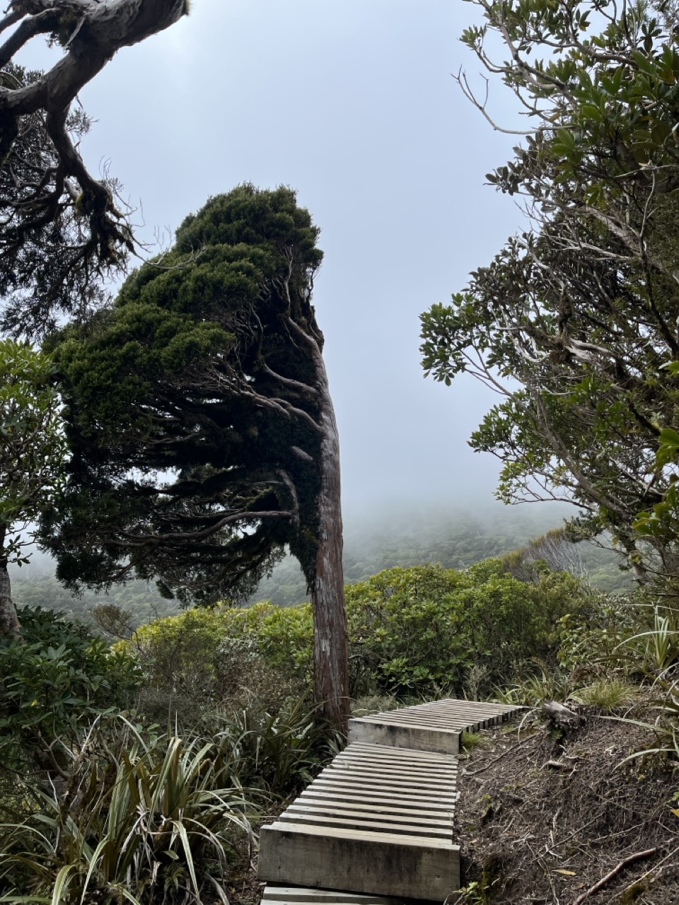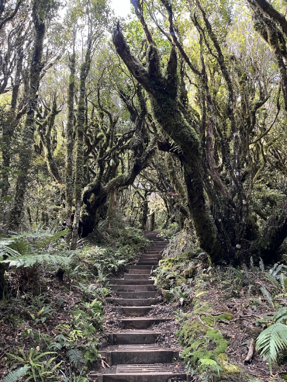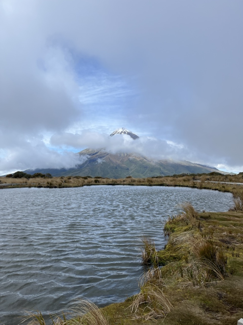 New Plymouth stand besonders wegen des Mt Taranaki auf meiner Bucket Liste und auch hier durfte eine Wanderung nicht fehlen. An einem schönen, sonnigen Tag machten ich und meine Mitfahrgelegenheit uns an den Aufstieg. Zweieinhalb Stunden ging es auf einem wunderschön präparierten Weg unzählige Stiegen nach oben. Immer durch den Urwald im Egmont National Park. Dieser Nationalpark schaut übrigens besonders auf einem Satellitenbild sehr lustig aus, da er einen perfekten Kreis mit etwa sechs Kilometer Radius um den Vulkan bildet, um den herum der gesamte Wald abgeholzt ist. Auf unserem Weg durch den Wald konnten wir immer wieder die Sonne und den blauen Himmel durch die Baumkronen durchleuchten sehen. Endlich über der Baumgrenze war die Sicht plötzlich gar nicht mehr so großartig, denn wir hatten den Wald gegen Wolken und Wind eingetauscht. So war die erhoffte Spiegelung des Berges in den Pukaki Tarns nur zu erahnen und auch nur dann, wenn der Berg für kurze Zeit hinter den Wolken hervorkam. Auch unser anschließender Abstecher auf einen kleinen Gipfel war komplett in Nebel gehüllt, was dazu führte, dass wir uns bei jeder Kuppe dachten: „Das ist jetzt aber der Gipfel“, aber kaum waren wir oben angekommen, sahen wir die nächste Kuppe im Nebel auftauchen.