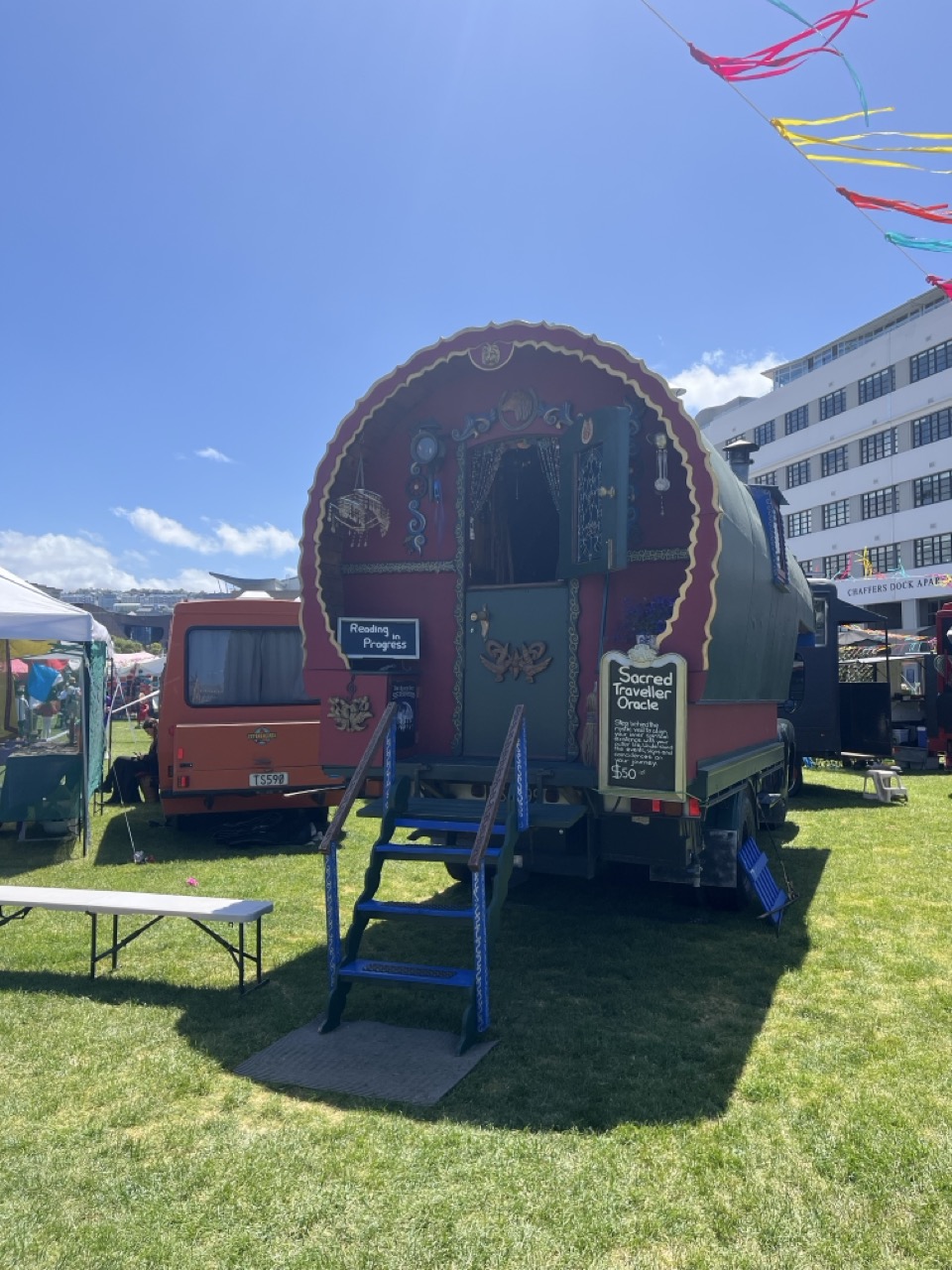Nach New Plymouth war meine nächste Station schon Wellington, wo ich nach ein bisschen über einer Woche immer noch bin. Wellington, die Hauptstadt Neuseelands, ist eine jener wenigen Städte, über die ich bis vor meiner Ankunft nur Positives gehört hatte und auch jetzt kann ich keine groß negativen Punkte hinzufügen. Schon direkt nach meiner Ankunft, auf dem Weg von der Busstation zum Hostel, wurde mir klar, dass Wellington deutlich schöner ist als Auckland – wobei das zugegebenermaßen nicht sonderlich schwer ist. Die Stimmung war allgemein viel freundlicher und offener als in Auckland, was vielleicht auch daher kam, dass es tatsächlich schöne, ansprechende Häuser gab. Außerdem freute ich mich auch einfach wieder, in einer Großstadt angekommen zu sein, wo es mehr gibt als ein Kriegerdenkmal, eine mehr oder weniger kleine und eher heruntergekommene Einkaufsstraße und das ein oder andere Cafe gab. Zudem hatte ich gehört, in Wellington könne man sehr gut essen gehen, was sich in den letzten Tagen durchaus als richtig herausstellte – sehr zum Leidwesen meines Bankkontos.  Auf meinem ersten Erkundugstrip stolperte ich zufällig über die Extravaganza Faire. Ich kaufte mir aber nur eine Portion mini Doughnuts, es war mir dann doch keine 60 Dollar wert, mir meine Zukunft voraussagen zu lassen.