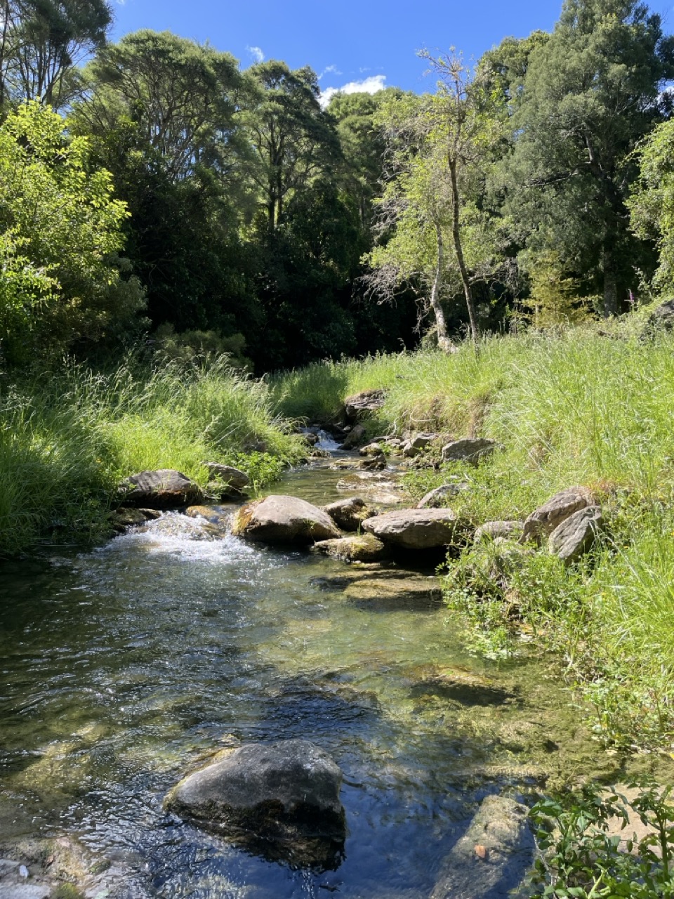 Nach dem Mittagessen hatte ich frei und das war der erste Moment, an dem mir so wirklich bewusst wurde, dass ich in den nächsten Tagen wohl viel Zeit mit meinen eigenen Gedanken verbringen würde – zumindest glaubte ich das zu diesem Zeitpunkt noch. Dummerweise hatte ich mein Buch auf der Fährfahrt ausgelesen und war noch nicht in der Stimmung mich in eine neue Materie zu stürzen, also war auch “in ein Buch flüchten” keine zufriedenstellende Option. Allzu schnell musste ich mir aber noch nicht selber Beschäftigung einfallen lassen, denn ich bekam einmal eine großflächige Tour über das Grundstück und dann ging es in einen nahegelegenen Gebirgsbach schwimmen. Gebirgsbach klingt kalt, war er aber gar nicht so sehr. Der Lake Taupo war deutlich kälter.